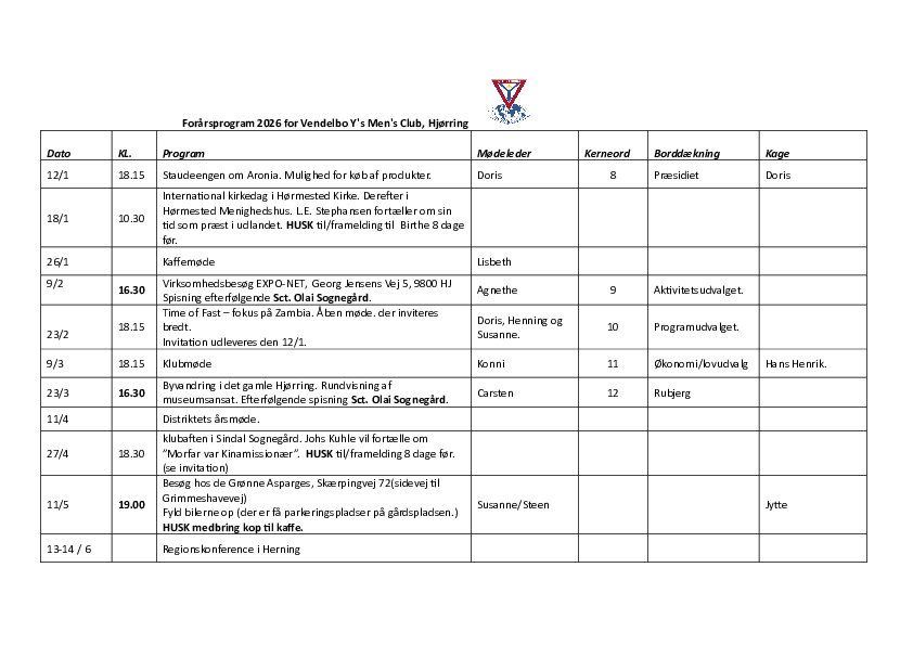 Vendelbo Y's Men's Club, Hjørrings forårsprogram 2026